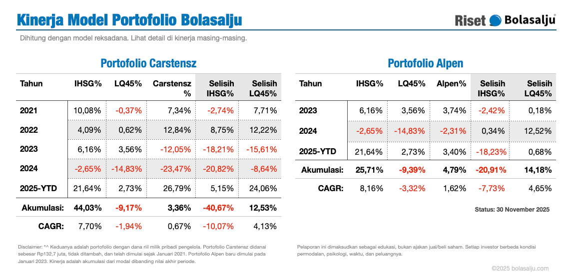 Tentang Portofolio Bolasalju: Mulai tahun 2023, kami memperkenalkan dua model portofolio Bolasalju yang bernama Alpen dan Carstensz. Portofolio Alpen dimulai pada Januari 2023 dan tahun ini sudah melalui perjalanan kinerja dua tahun. Portofolio Carstensz telah berjalan empat tahun.