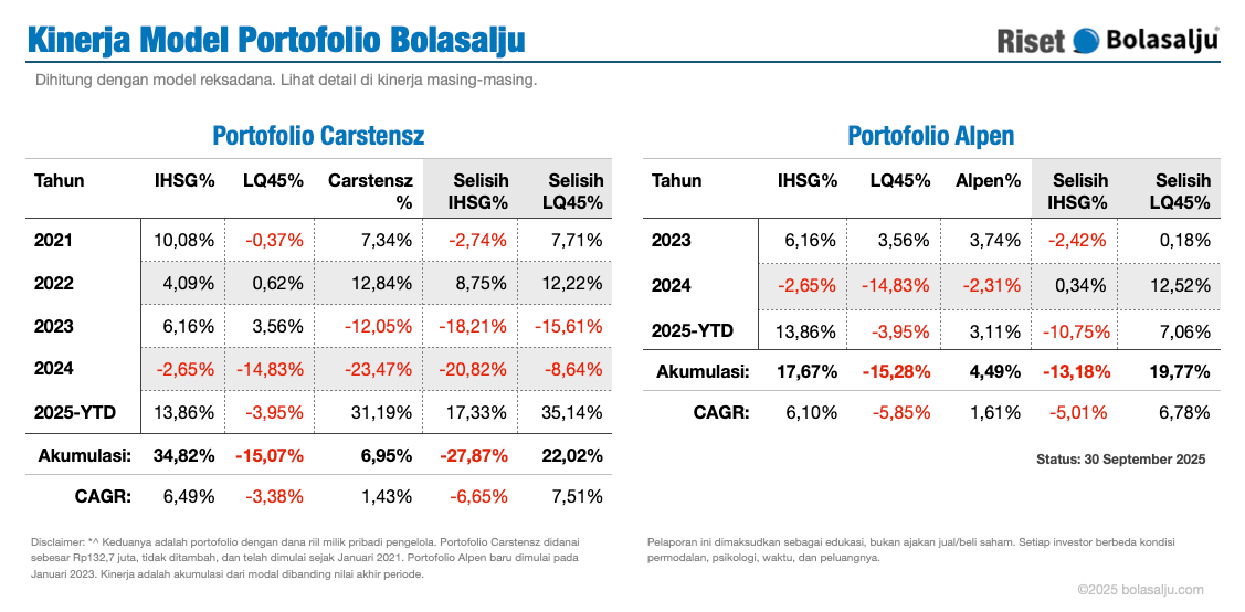 Tentang Portofolio Bolasalju: Mulai tahun 2023, kami memperkenalkan dua model portofolio Bolasalju yang bernama Alpen dan Carstensz. Portofolio Alpen dimulai pada Januari 2023 dan tahun ini sudah melalui perjalanan kinerja dua tahun. Portofolio Carstensz telah berjalan empat tahun.